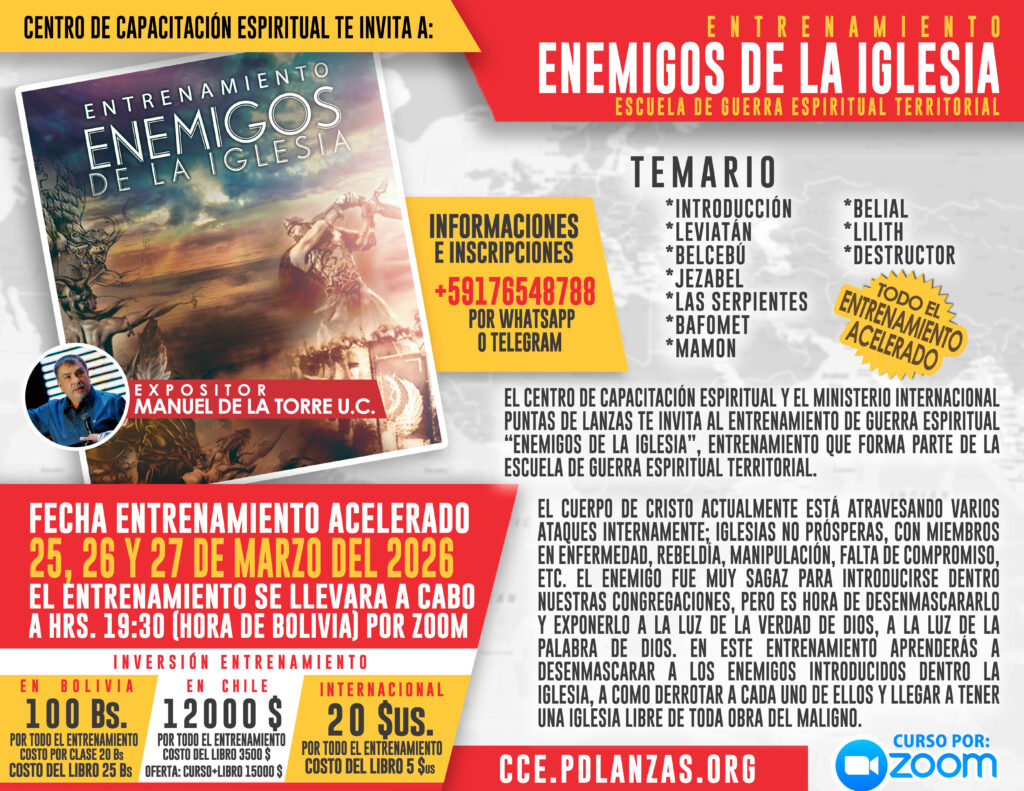 El Centro de Capacitación Espiritual y el Ministerio Internacional Puntas de Lanzas te invitan a este entrenamiento que forma parte de la Escuela Profética.